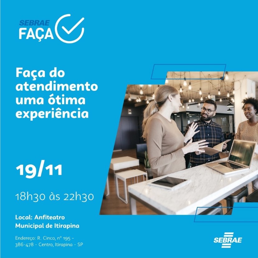 Faça do Atendimento uma ótima experiência (Presencial) “Transforme o atendimento em uma experiência excepcional! Supere desafios, domine técnicas de conquista, manutenção e fidelização de clientes, tudo através de estratégias de atendimento impecáveis. Aprenda a criar interações memoráveis e torne-se um mestre na arte do atendimento de qualidade!” Evento gratuito e para *maiores de 18 anos*! 📅 Data: 19/11/2024 – 18:30h às 22:30h 📍Presencial ; Anfiteatro Municipal de Itirapina R. Cinco, n° 195 Centro, Itirapina Faça a sua inscrição agora mesmo, as vagas são limitadas! 👇👇 https://forms.office.com/r/ZWbVSUBBW3