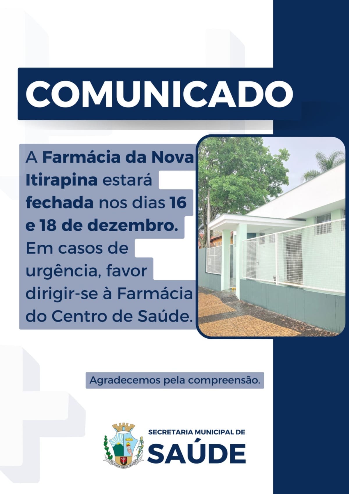 A farmácia da Nova Itirapina estará fechada nos dias 16 e 18 de dezembro em caso de emergência se dirigir a farmácia do centro