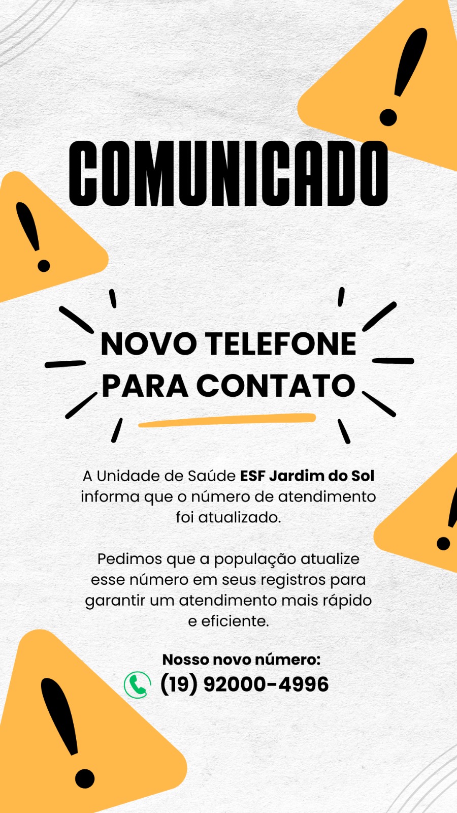 A Unidade de Saúde ESF Jardim do Sol informa que o número de atendimento foi atualizado.