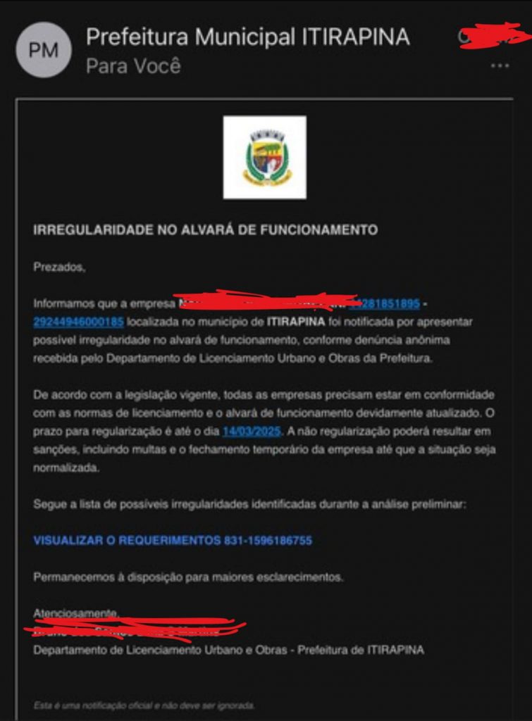 Os e-mails fraudulentos – Não utilizam o brasão oficial da Prefeitura de Itirapina. – Mencionam um inexistente Departamento de Licenciamento Urbano e Obras. – Solicitam informações pessoais e/ou financeiras dos munícipes.